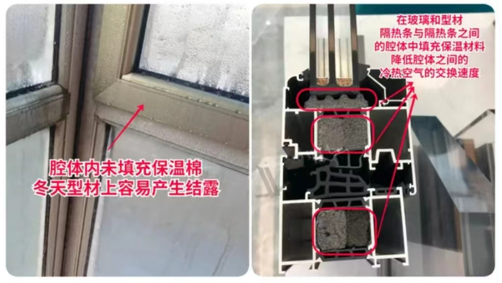 一般會填充聚氨酯發(fā)泡或者是保溫棉,雖然提升不大,但作為高性能是必須的。有的廠家會在每一個腔體都填充,有的話只填充隔熱條腔體,我認(rèn)為只需要填充隔熱條腔體,因為這個地方才是切斷溫度傳導(dǎo)的。
